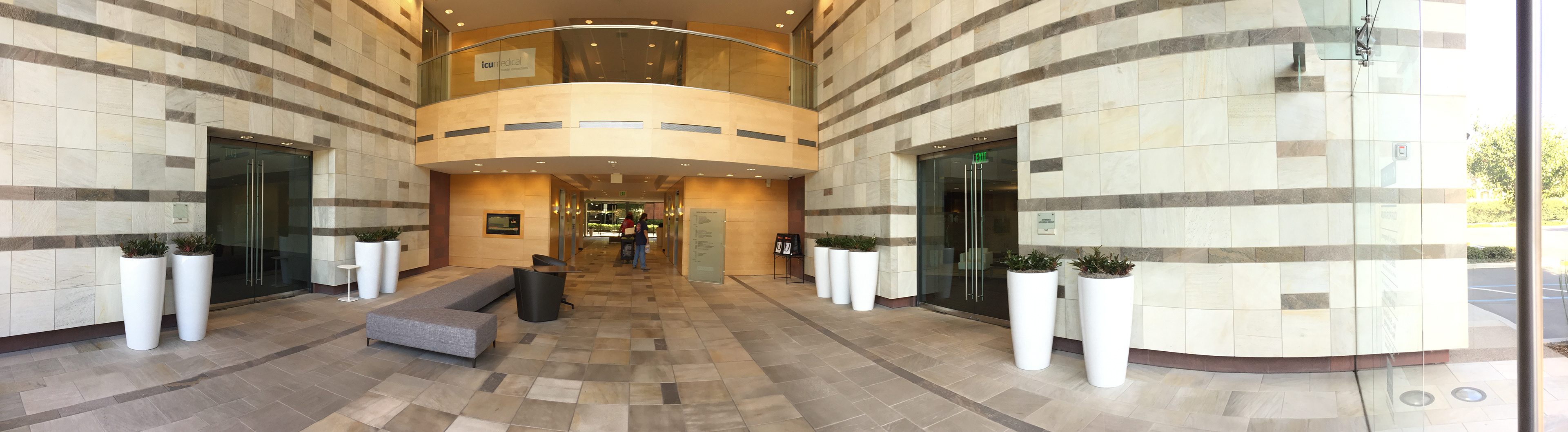 The design concept for renovating two-story Siamese lobbies of buildings 13500 & 13520 focused on giving each lobby a unique character while retaining a common aesthetic. Both lobbies share similar resolve for defining main tenant entries by means of added steel surrounds, wood slatted resurfacing of balconies, and refinished maple panels at elevator shafts. Each lobby is given a distinctive aesthetic by various wainscot tile shapes, pendant fixture geometry, furnishing and fabrics layout/selections, as well as the floor stencil pattern.