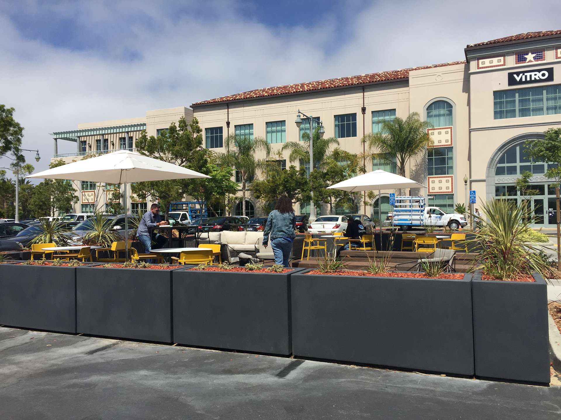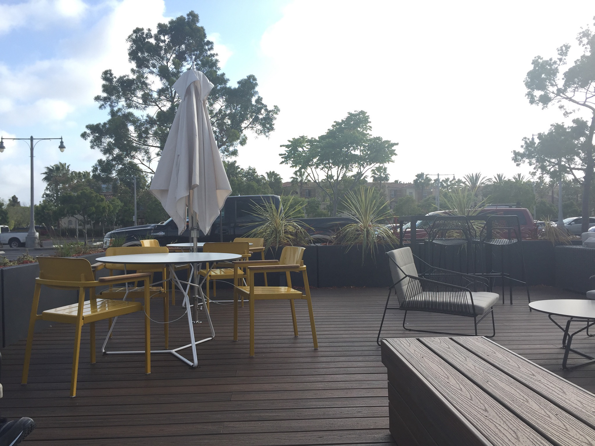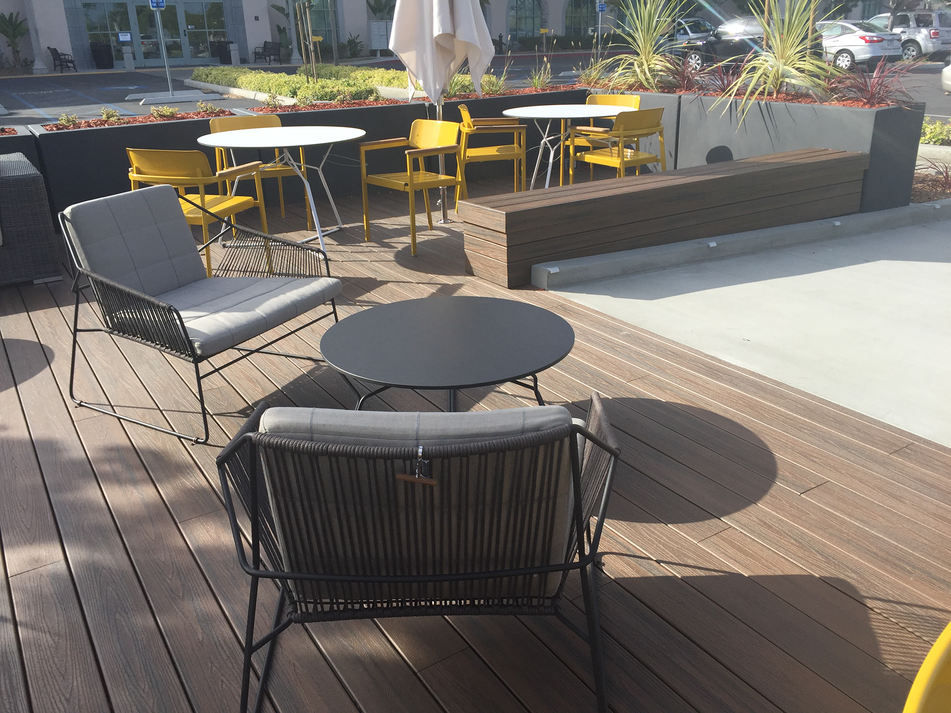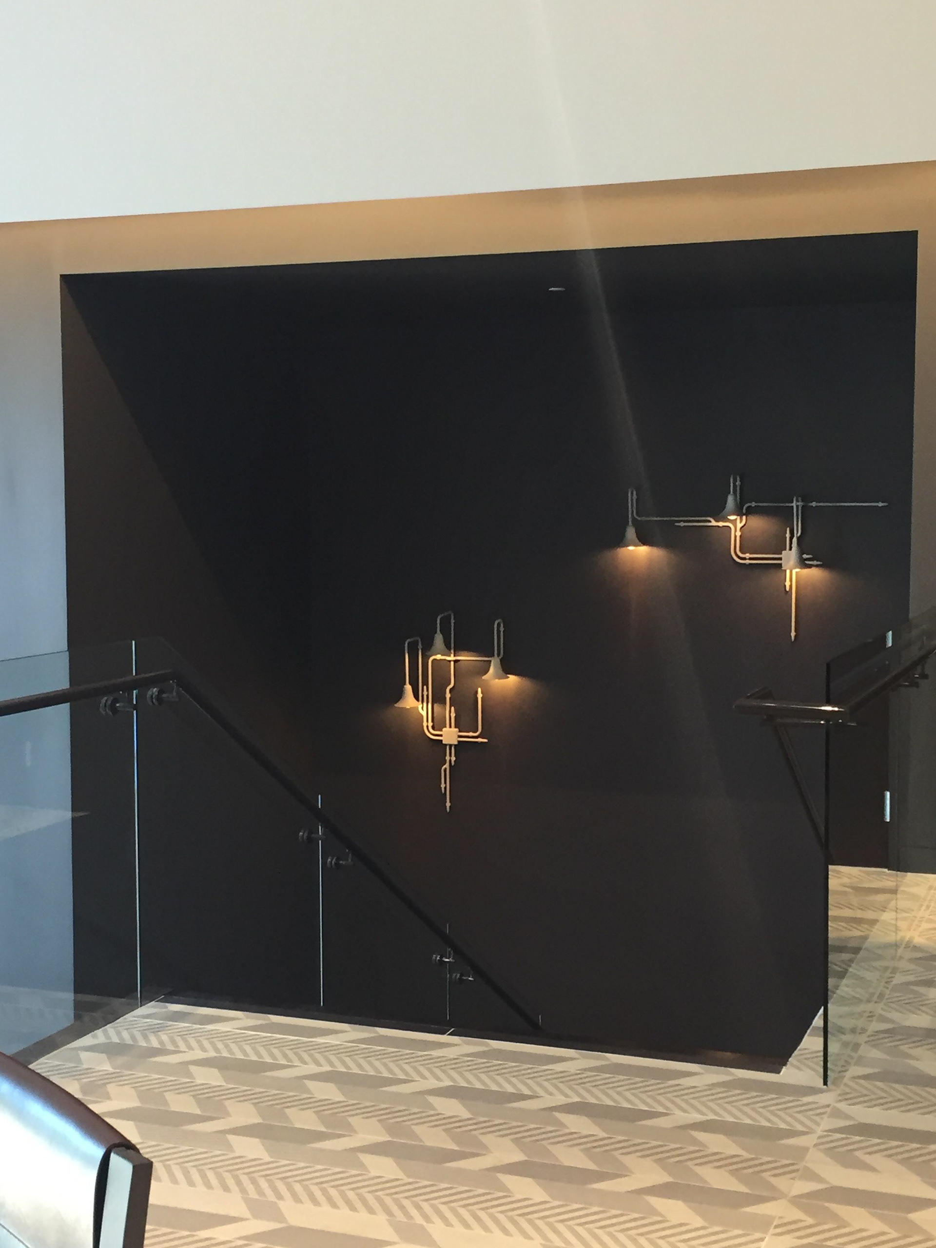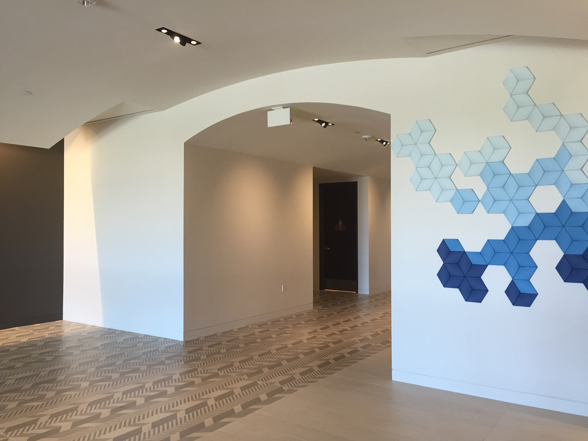 View of selected furnishings, custom wall installation, funnel portal entries at existing tenant main-entries, and retrofit of existing balcony with recessed glass baluster